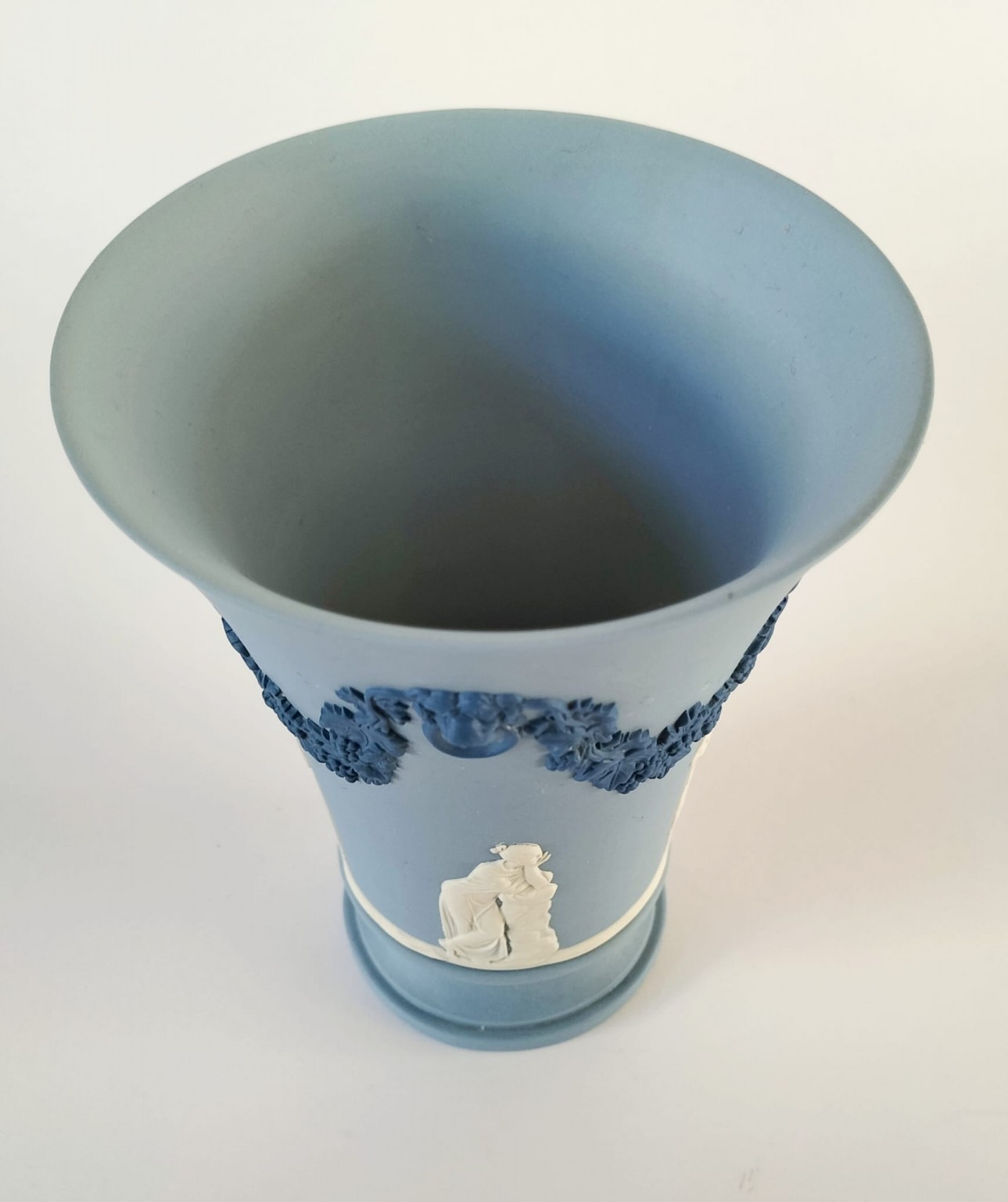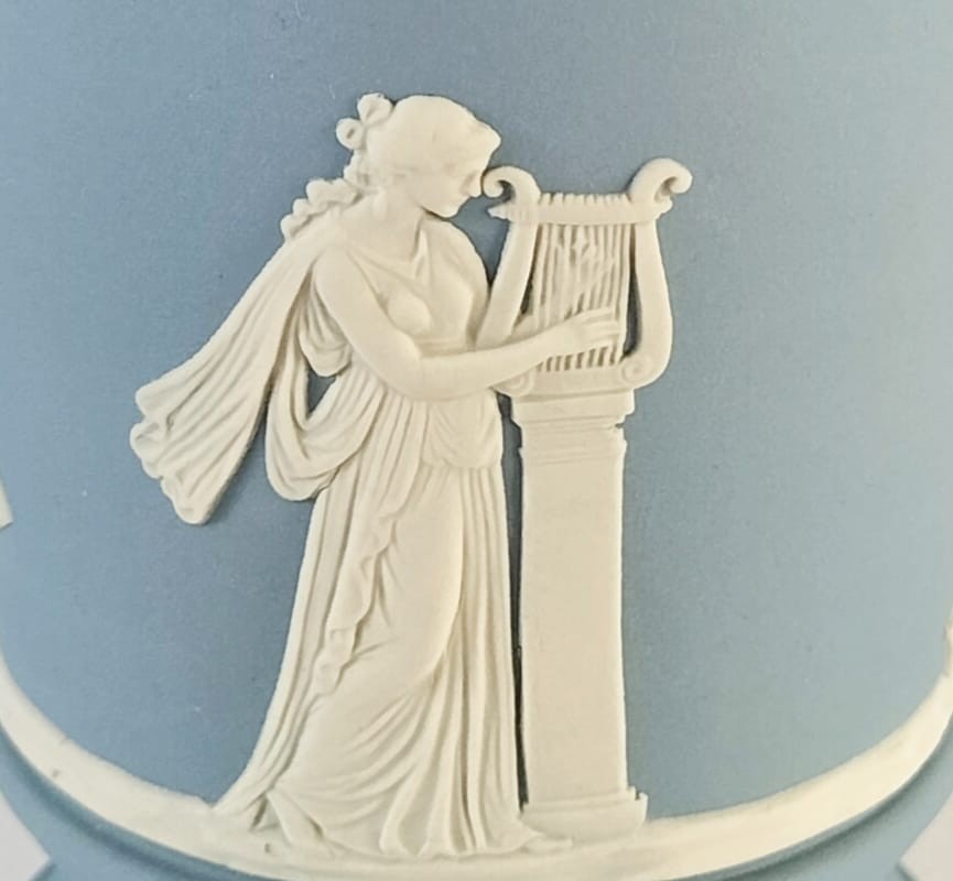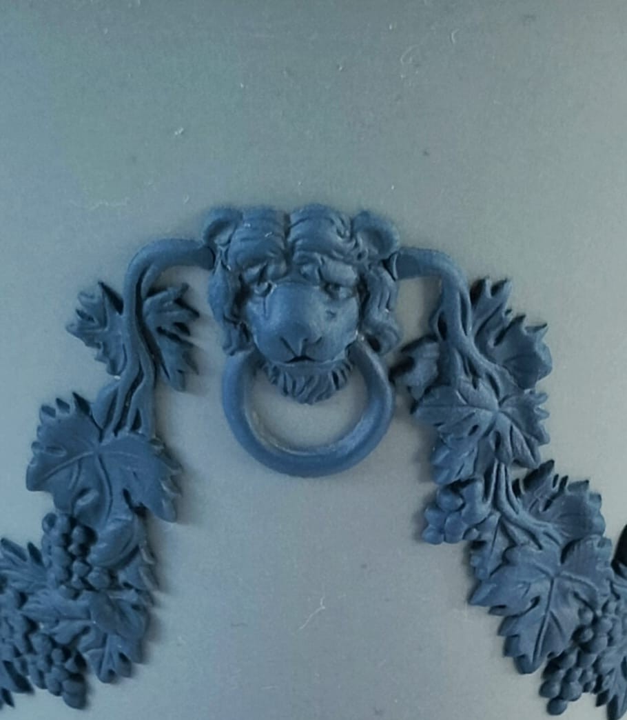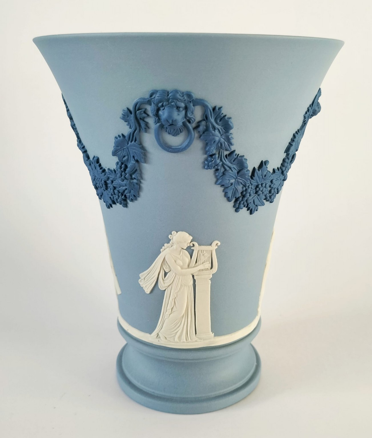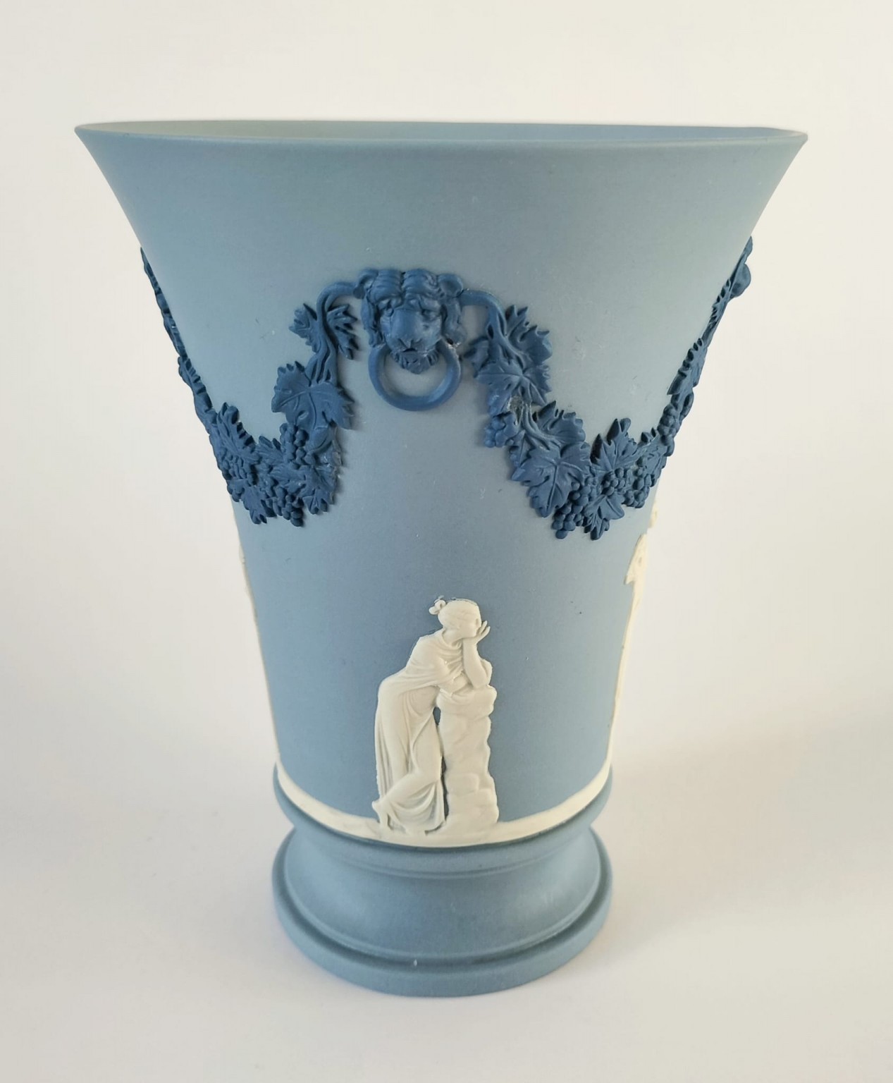 A Wedgwood tri-colour jasperware vase featuring white bas-reliefs a round the outside and portland blue bas-reliefs of a lions head on each side along with a vine garland.