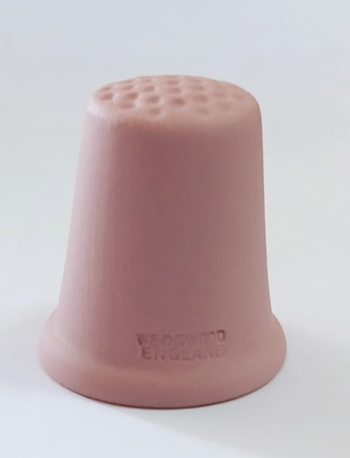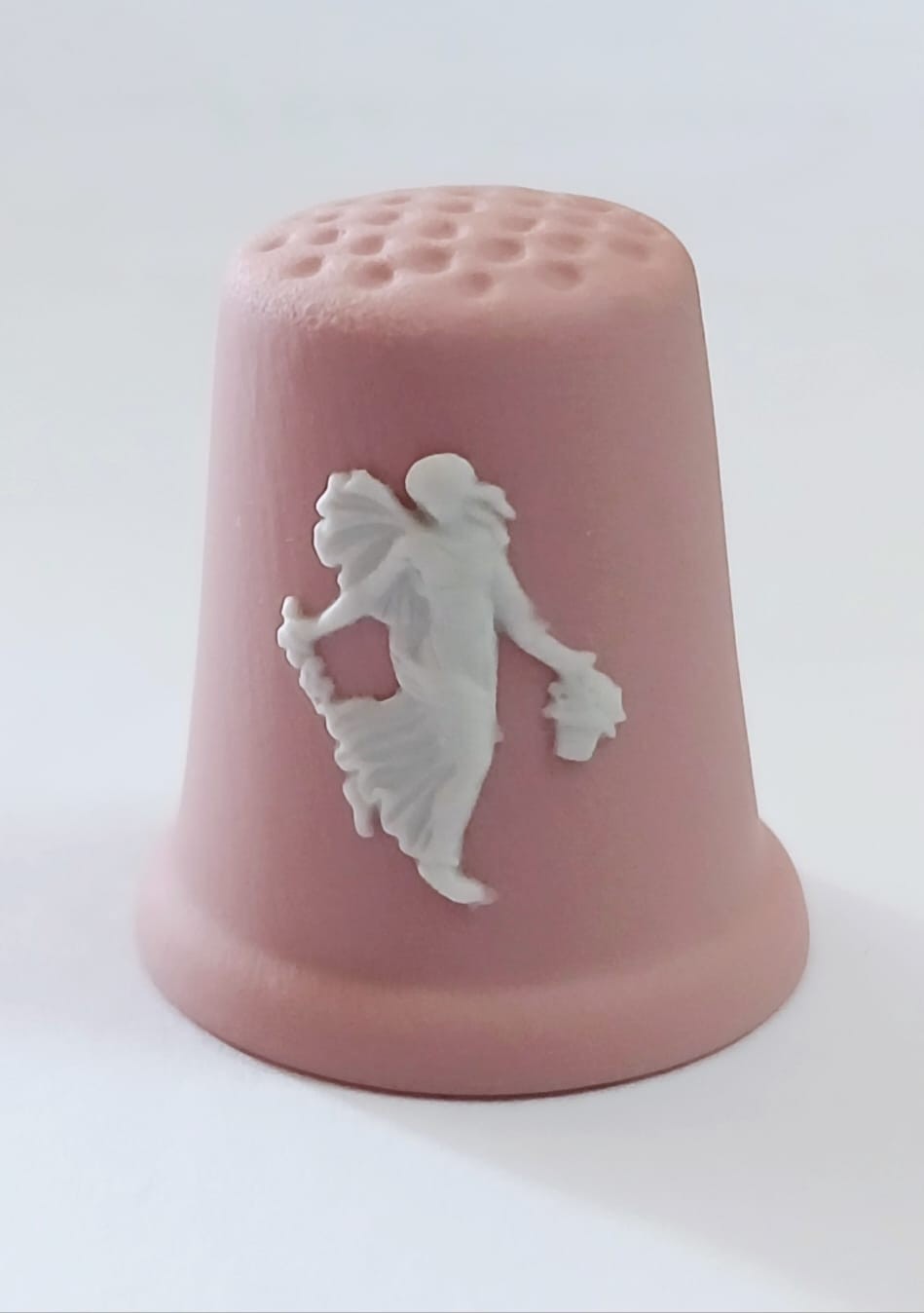 A Wedgwood pink jasperware thimble featuring a white bas-relief of a Dancing Hours figure.