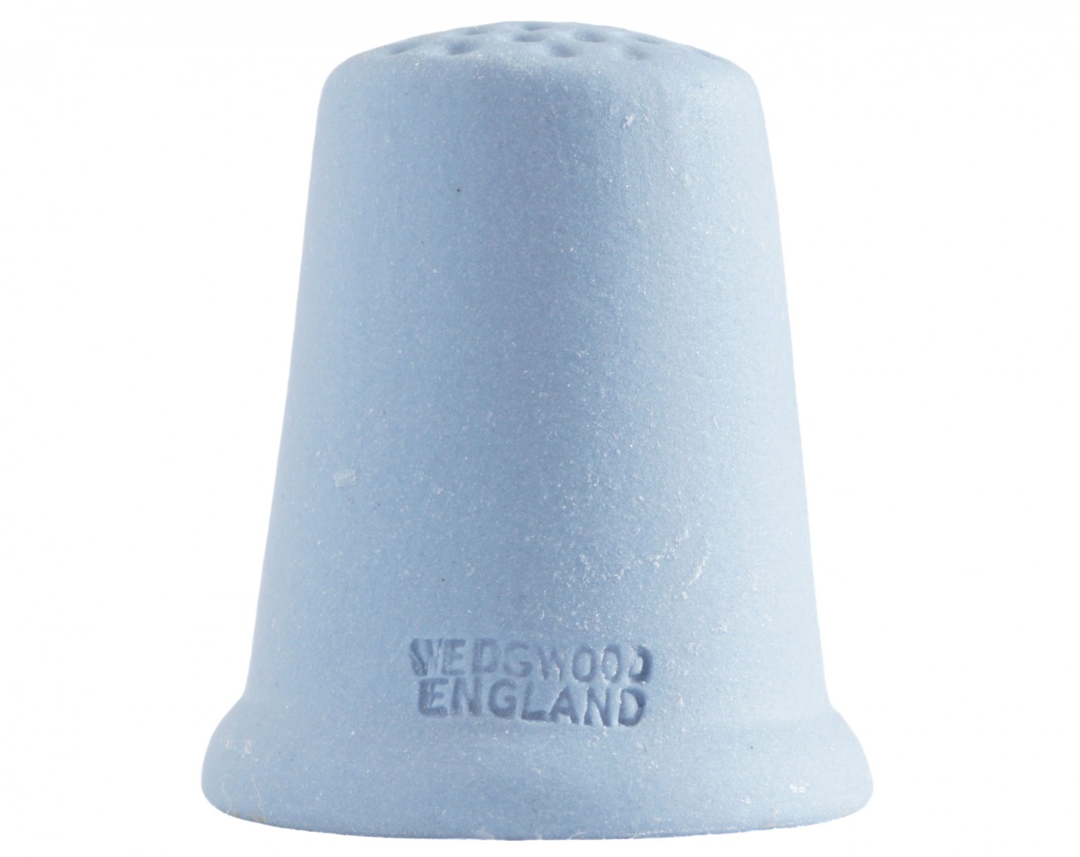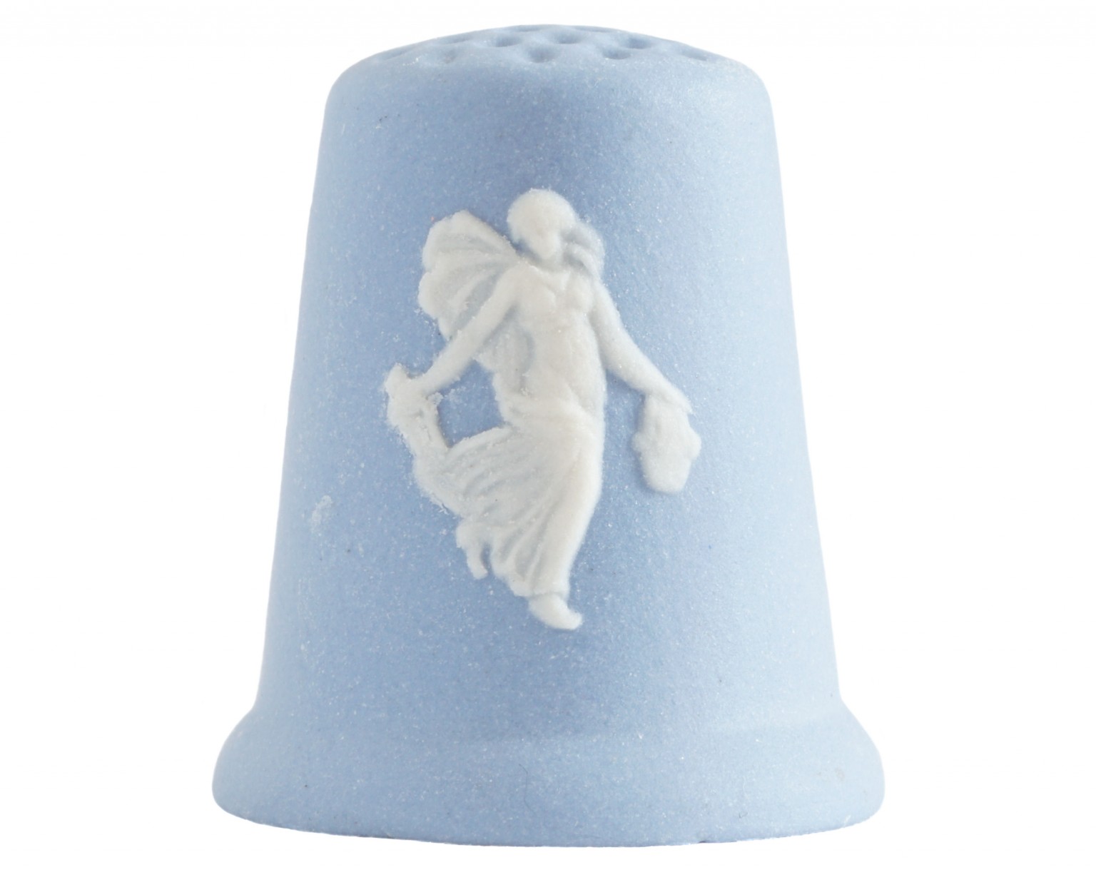 A Wedgwood blue jasperware thimble featuring a Dancing Hours figure.