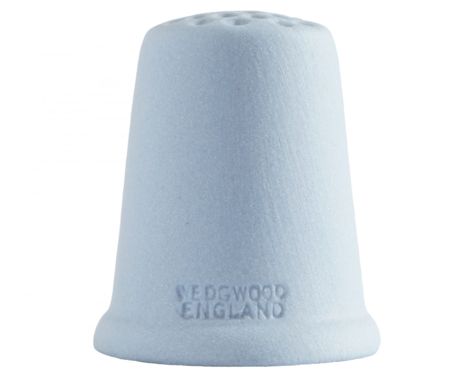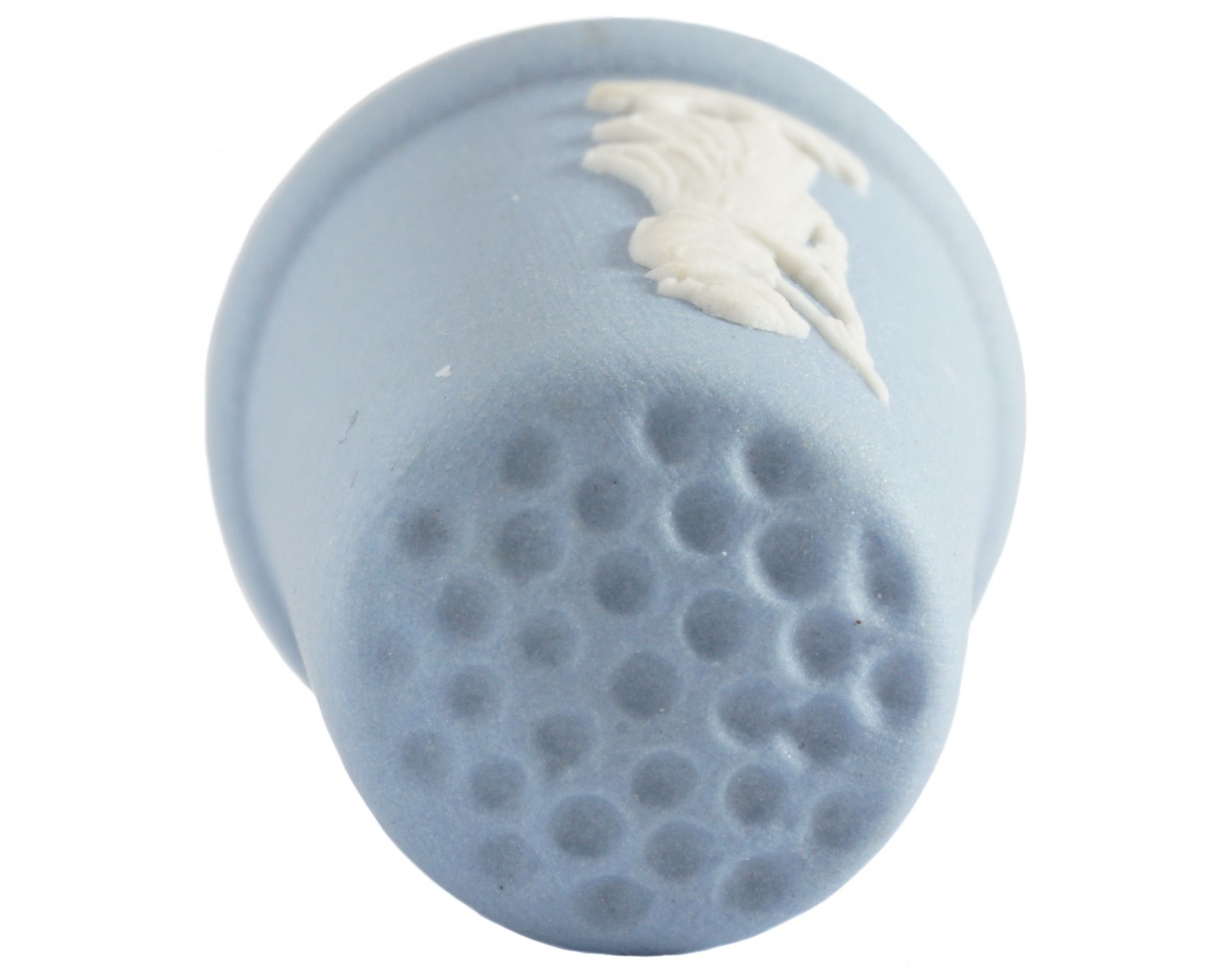A Wedgwood blue Jasperware thimble featuring a white bas-relief of a Spinner.
