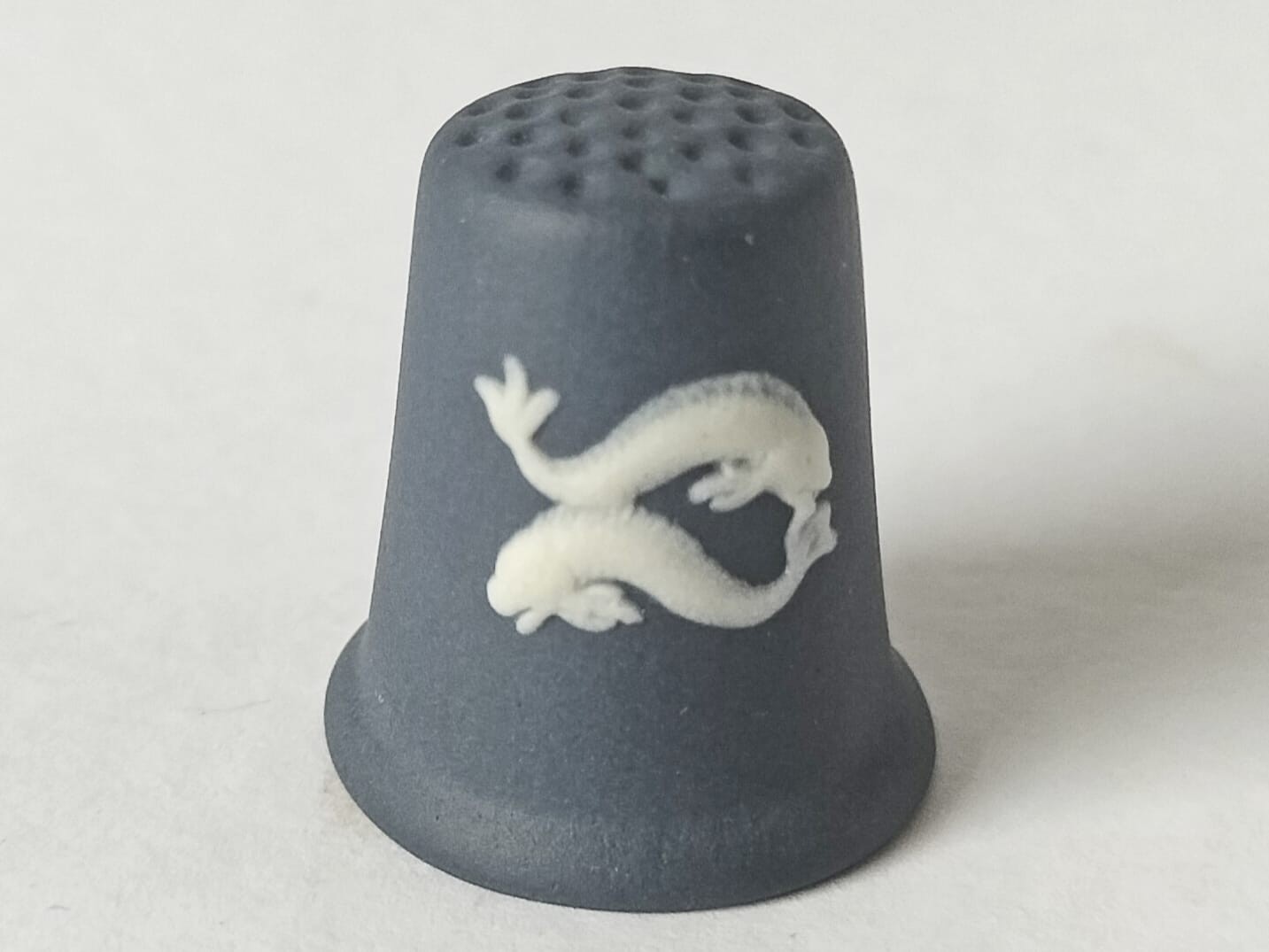 A Wedgwood portland blue jasperware thimble featuring a white bas-relief of fish, representing Pisces the twelfth astrological sign of the zodiac.