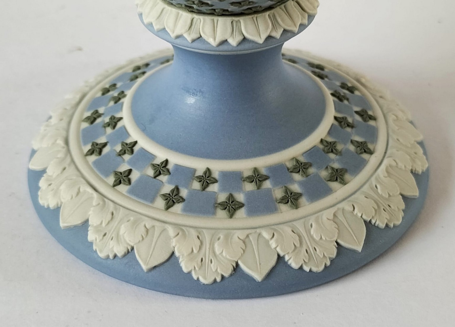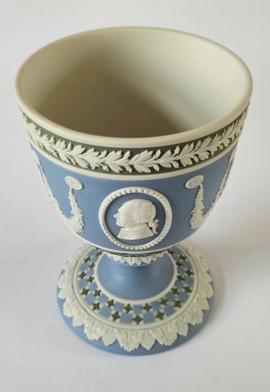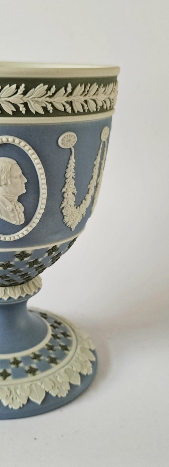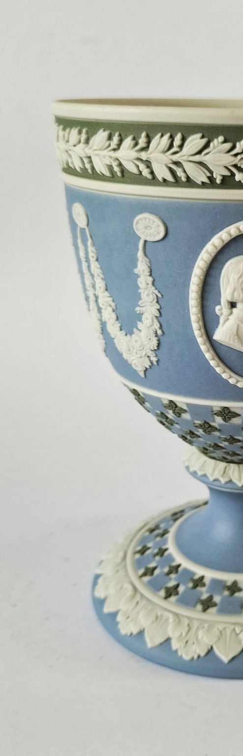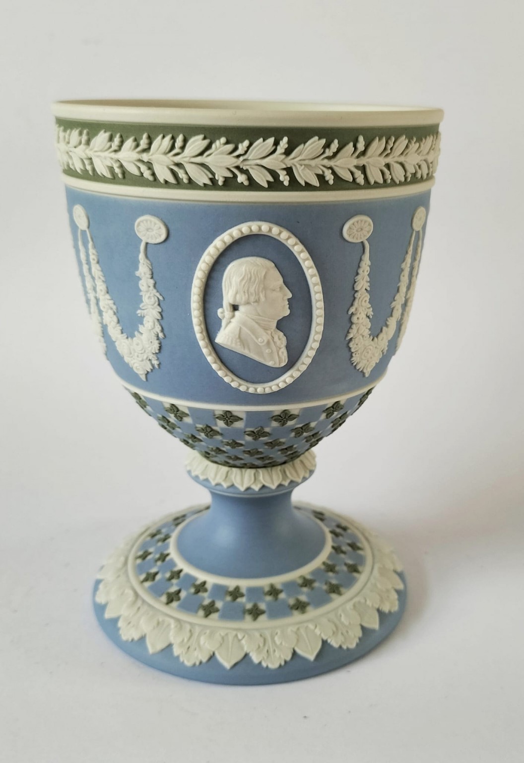 A Wedgwood diced chalice goblet manufactured in pale blue, white and sage green jasperware, produced for American Independence Bicentennial 1776-1976. Featuring portrait medallions of George Washington and Thomas Jefferson.