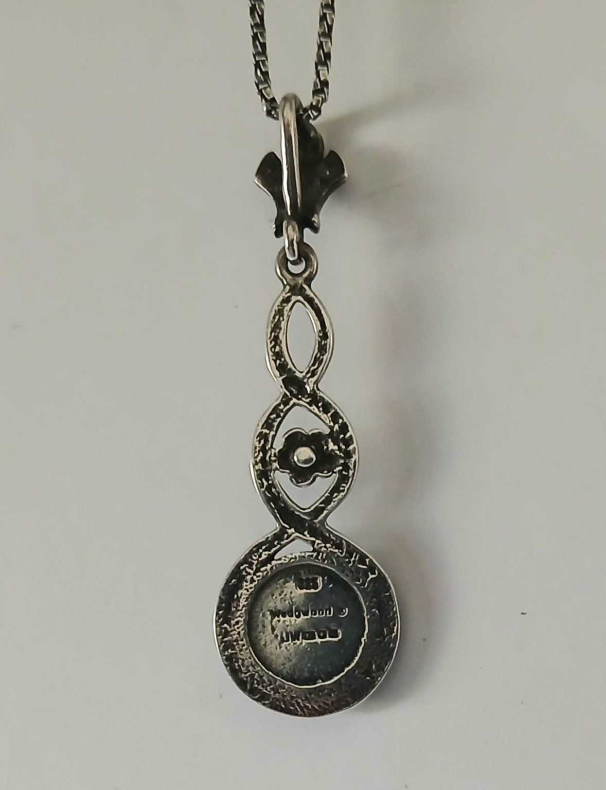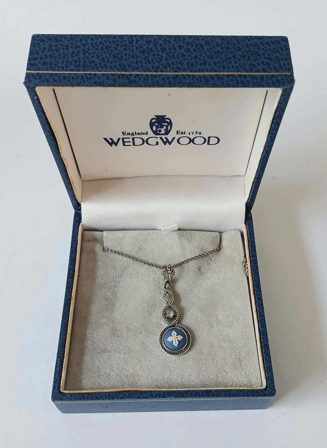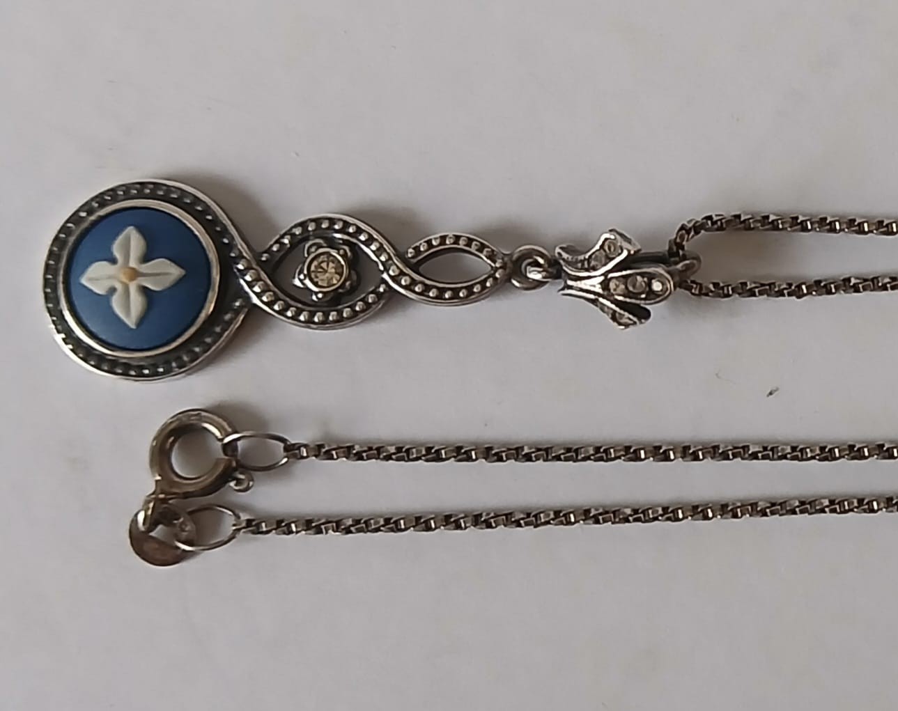 An ornate Wedgwood tri-colour jasperware Daisy pendant hung on a Silver chain.