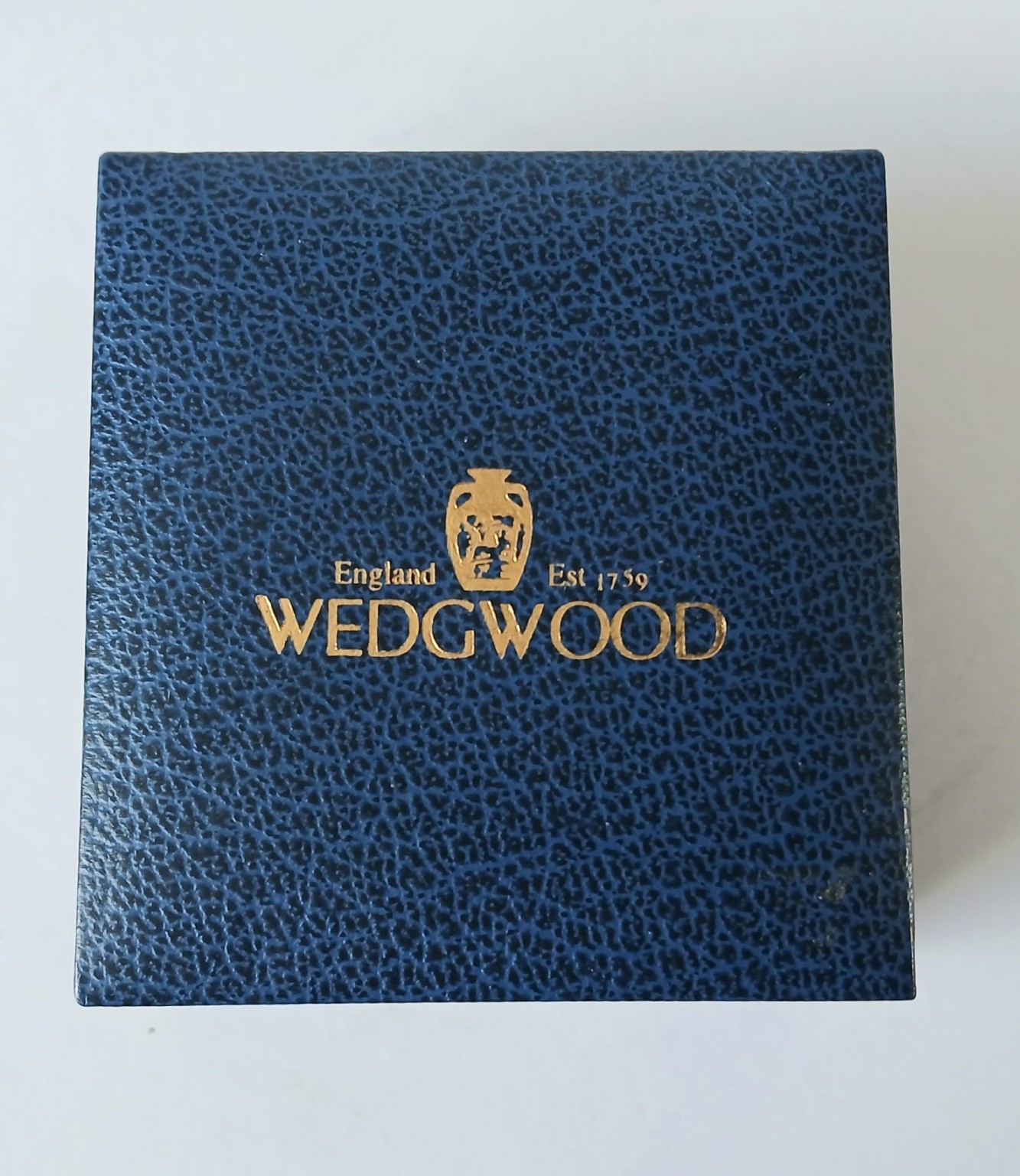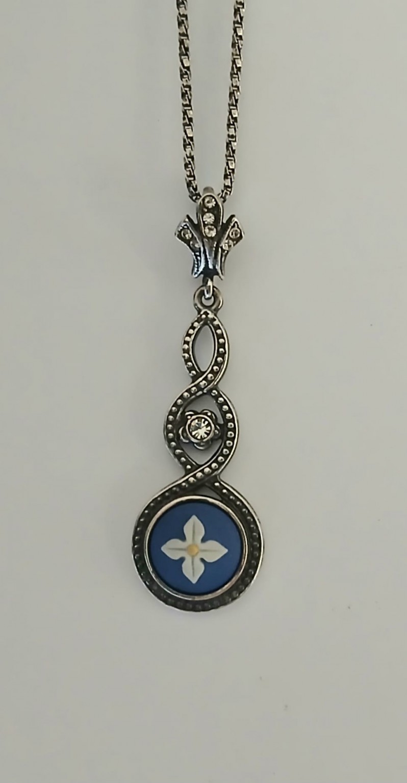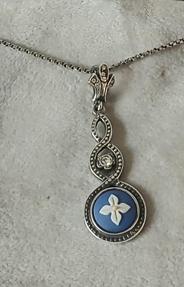 The pendant is Royal Blue jasperware featuring a white Daisy with a cane yellow centre set in a Silver hallmarked surround.