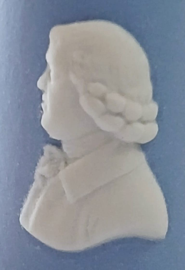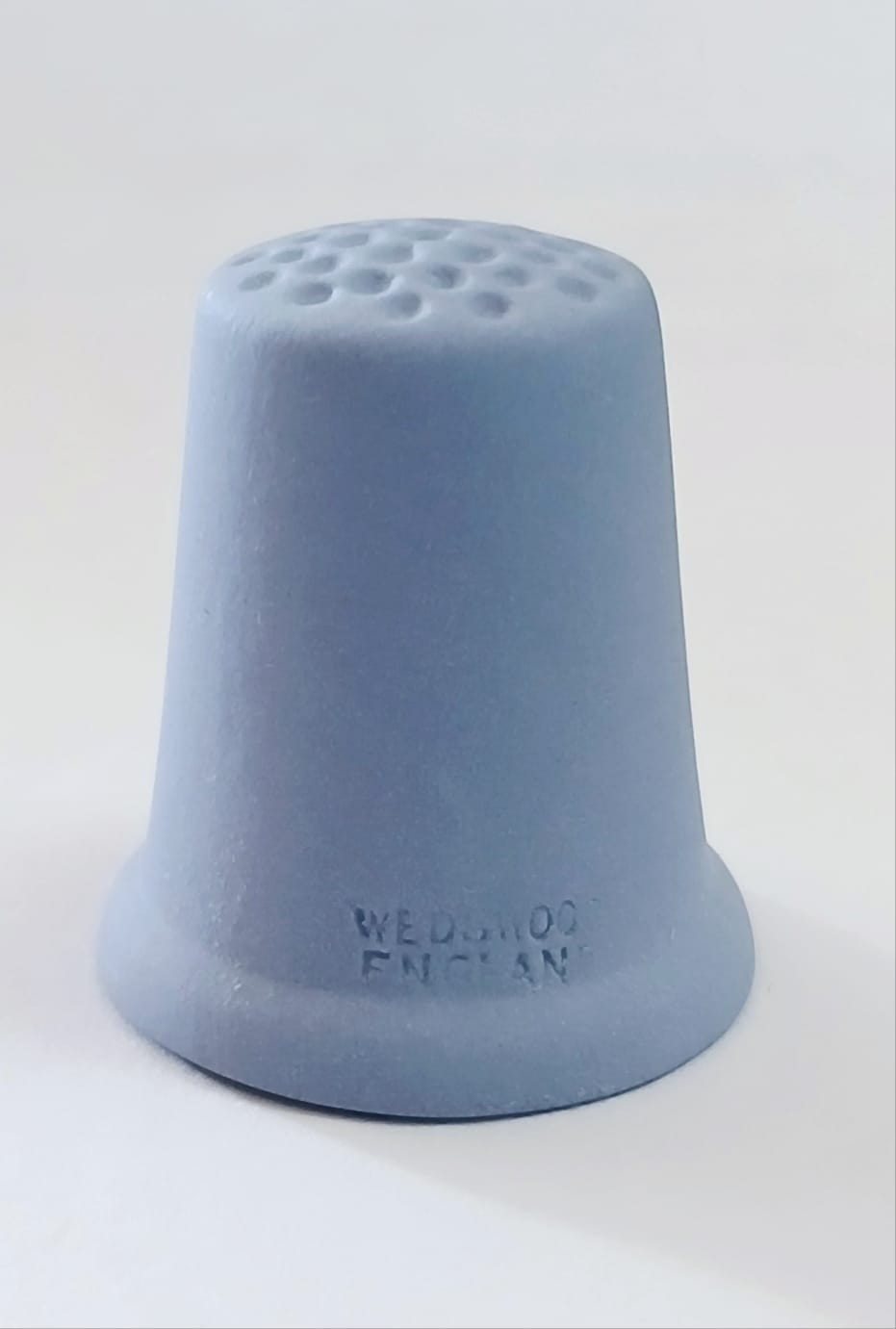 A Wedgwood blue jasperware thimble featuring a white bas relief of Josiah Wedgwood.