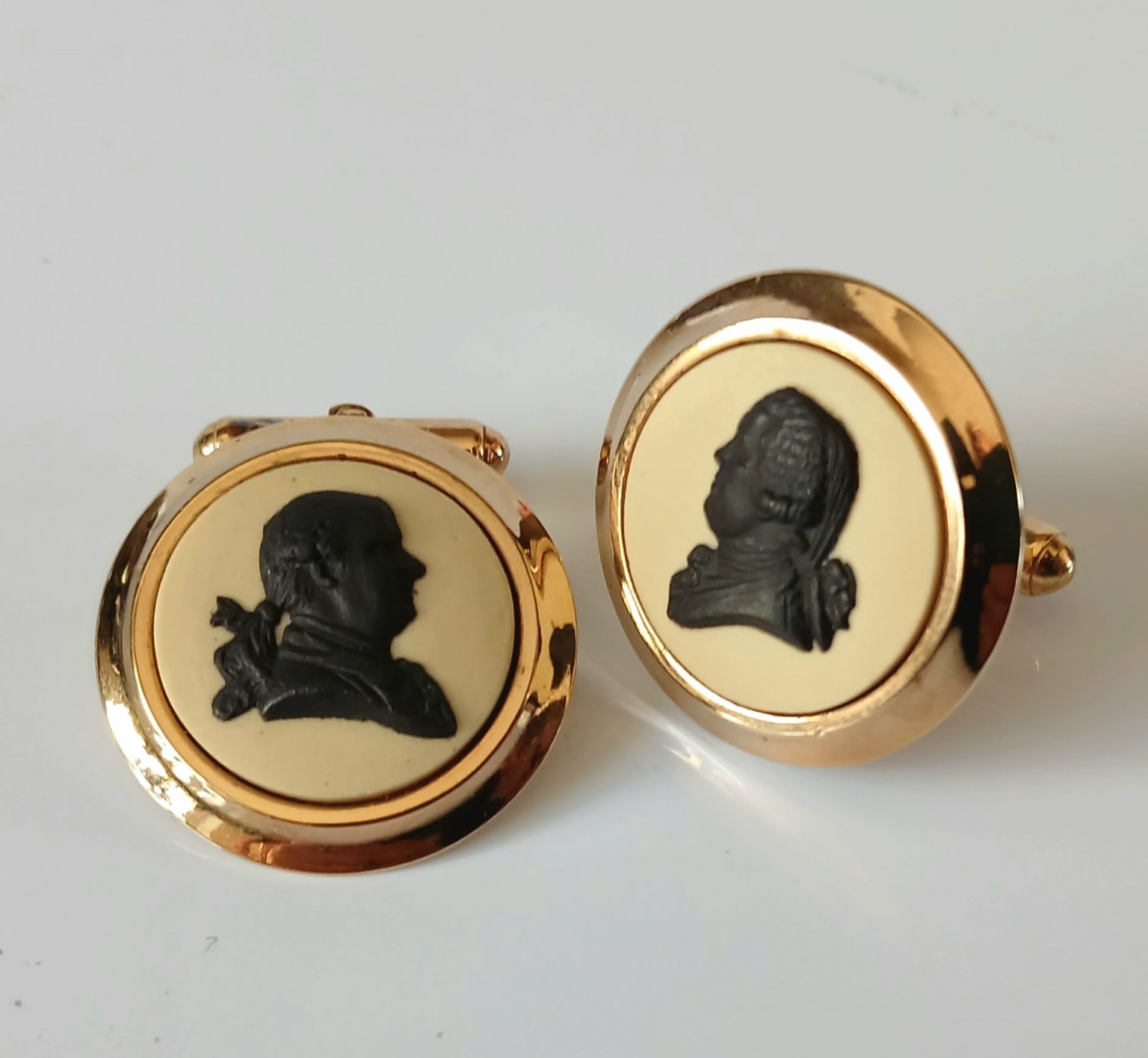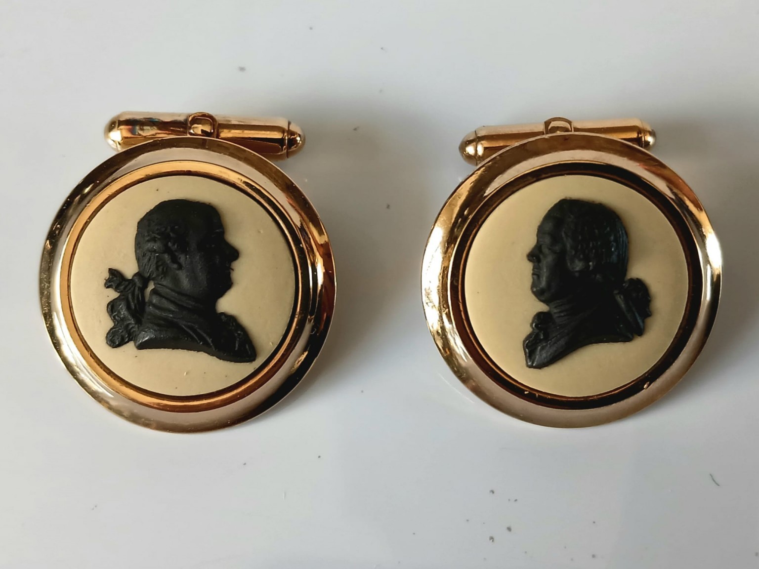 A pair of very unusual Wedgwood Cane Jasperware cufflinks featuring a black bas-relief of English Potters Josiah Wedgwood and his partner Thomas Bentley.
