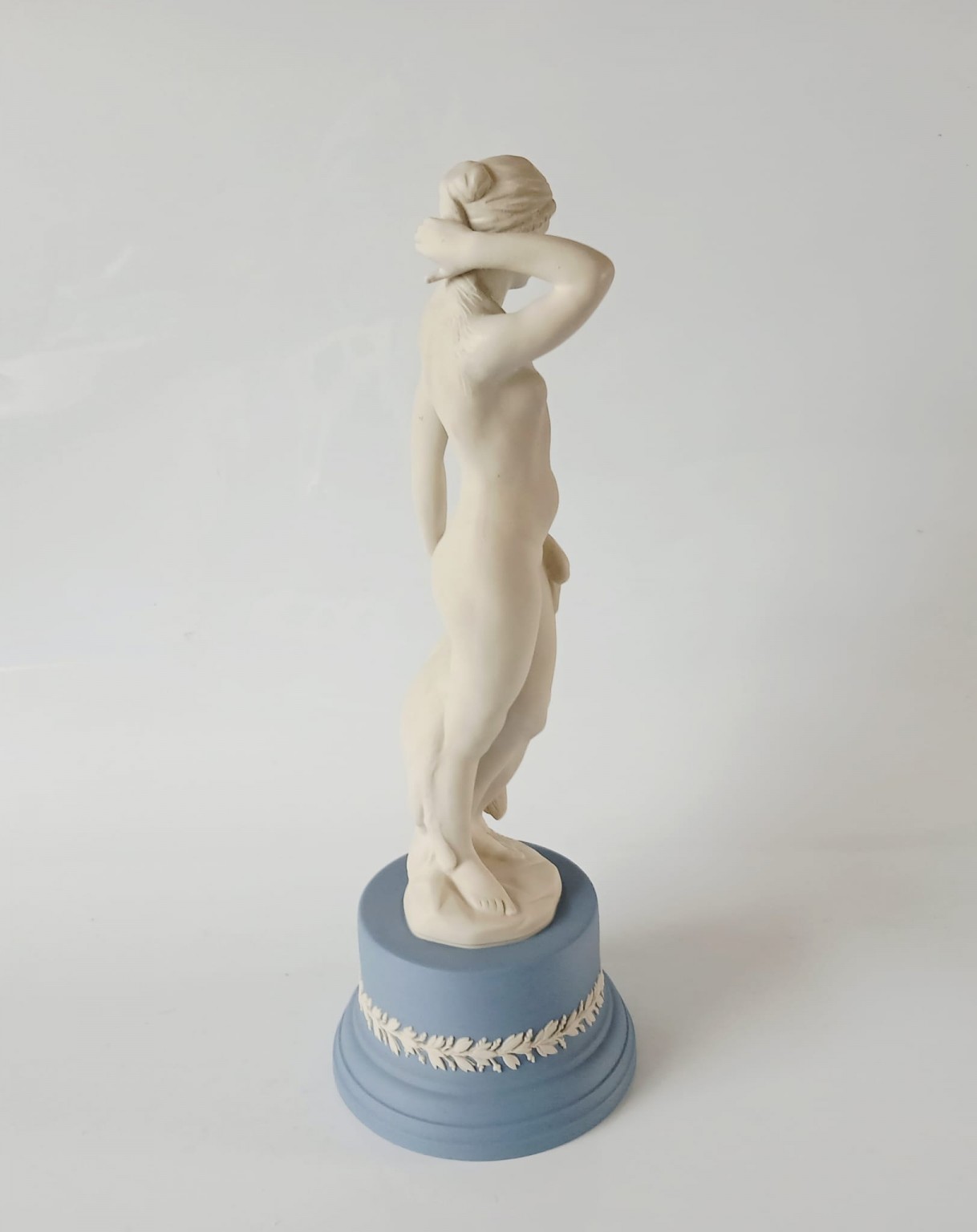 The figure stands approximately 9 3/4 inches tall and is impressed "Wedgwood Made in England" on its base.